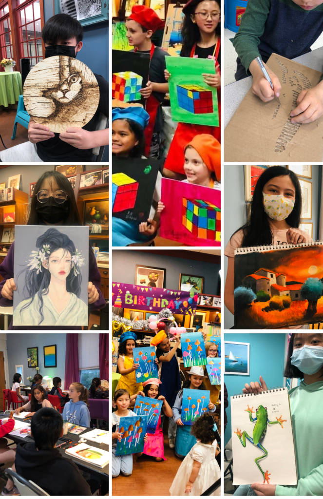 We offer in-person and online lessons for children and adults, as well as painting parties!